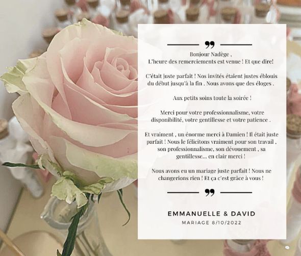 Nous avons le plaisir de partager avec vous quelques témoignages de mariés qui nous ont fait confiance dans l'organisation de leur mariage au Château de Rajat.