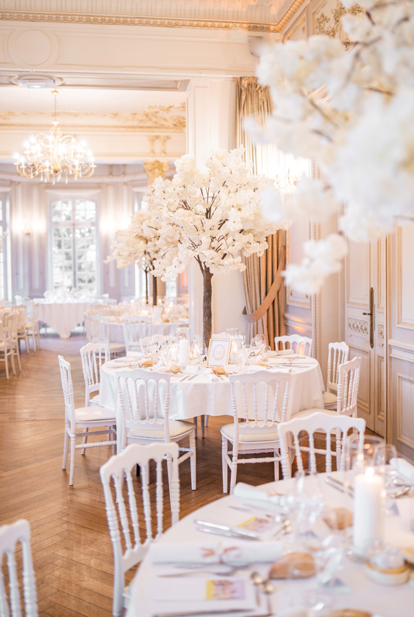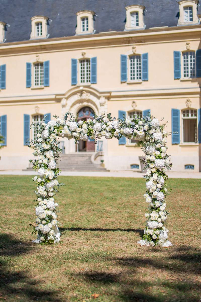 Ce cadre idyllique a été sublimé par la décoration romantique et chic réalisée par Audrey Levitte que ce soit pour la cérémonie laïque en bord de bassin ou dans le, déjà somptueux, salon Auguste et Louis Lumière ou encore avec la création d’un ciel végétal sous la verrière.