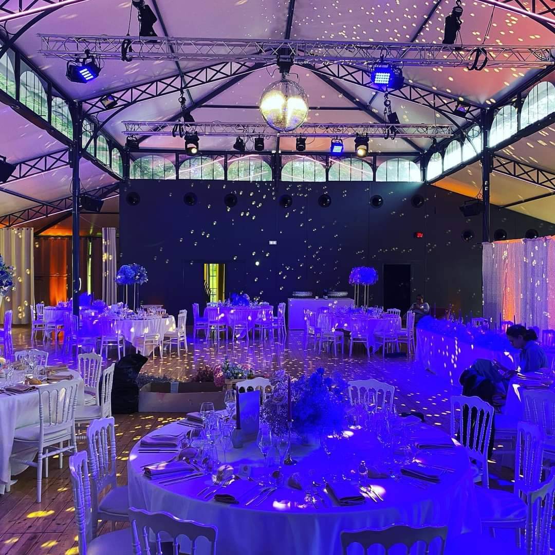 Sa structure en verre et métal offre une vue panoramique sur le parc verdoyant du château de Rajat, créant un cadre idyllique pour vos événements.