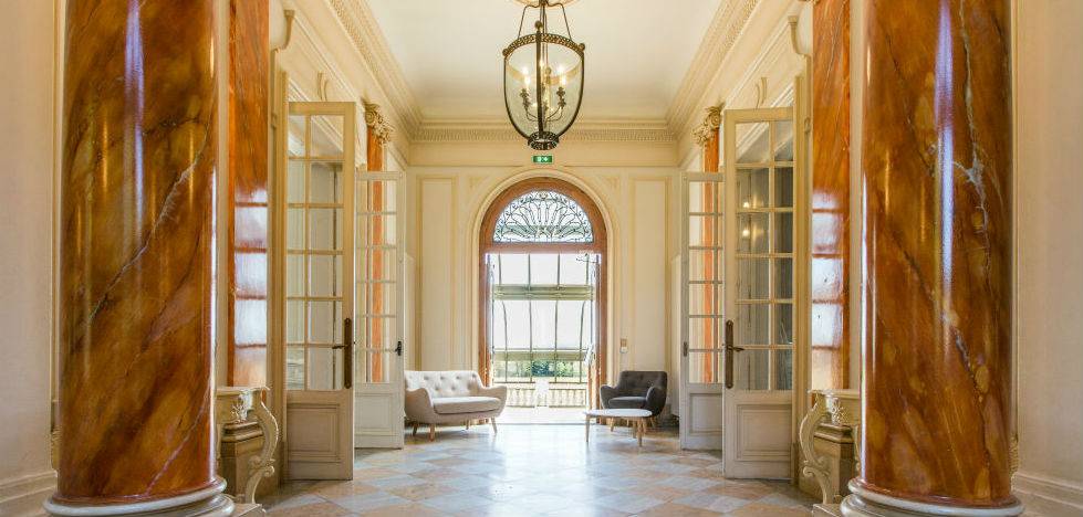 Il dispose de 4 belles salles de réception, au rez-de-chaussée, pouvant accueillir jusqu’à 190 personnes en repas assis et plus de 250 personnes en cocktail, donnant sur une magnifique verrière avec vue panoramique sur le parc.